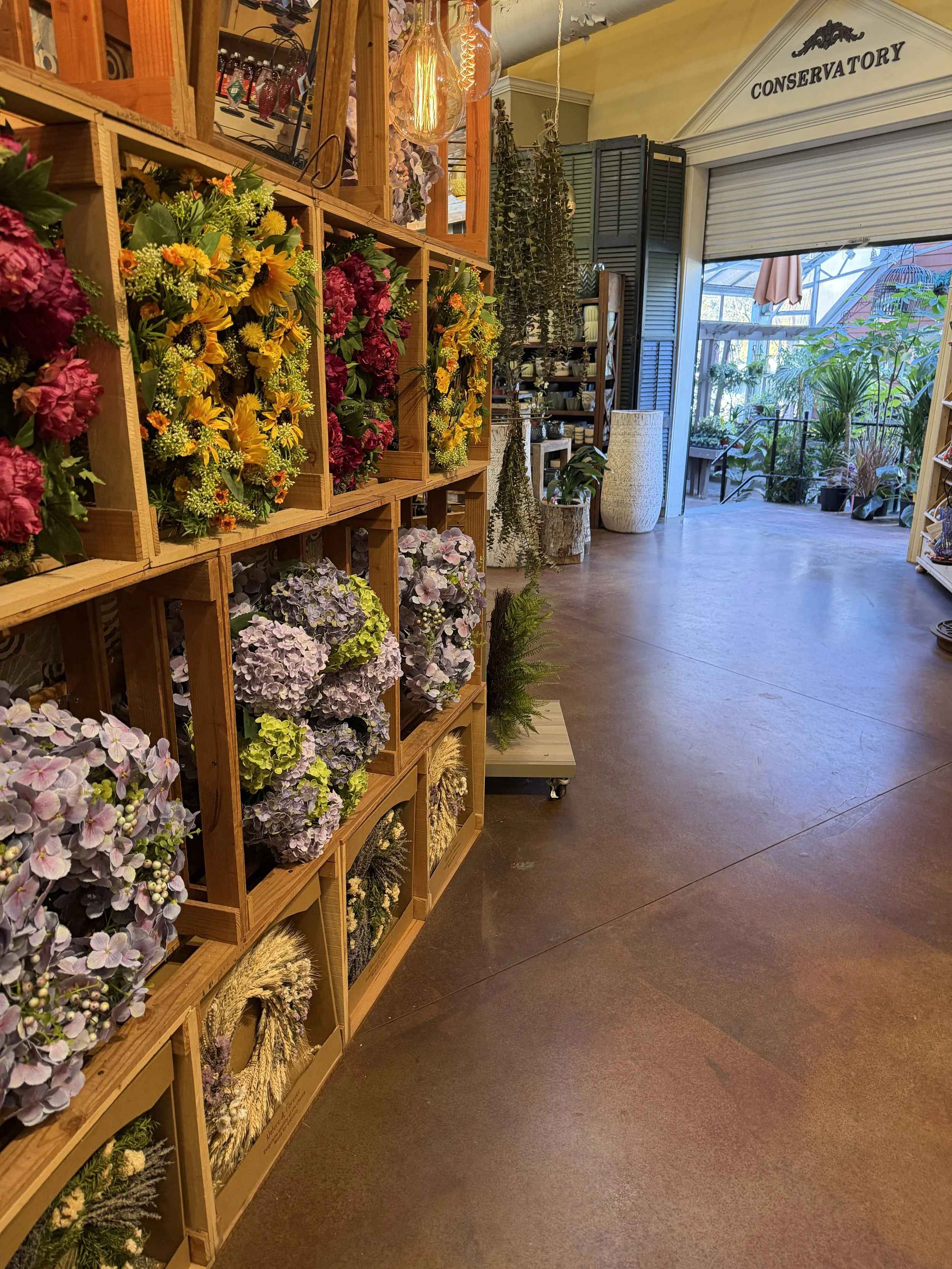 The display areas feel less like shopping and more like walking through a contained season. Plants cluster in soft arrangements, textures layered against glass and light. Even the sound shifts. Footsteps soften. Conversations lower. It becomes easy to linger.